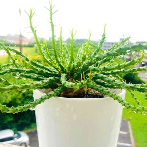 こんにちは(^^) 今日も気持ちの良い1日でした٩( ᐛ )و タコさんついでにタコさん🐙(๑•̀ - •́)و ちゅーちゅーたこかいな٩(ˊᗜˋ)و 先日渋谷園芸さんから迎えた しなしなに萎れてた ユーフォルビア フラナガニー 孔雀丸さん(*´`) Euphorbia flanaganii 水やりして通風、日当たり良い場所に 置いたら2日程でビンビンに٩( ᐖ )۶ お花さんは、これからかなぁ(‥ )ン? その様子次第で落ち着いたら植え替えですねぇ(*´`)