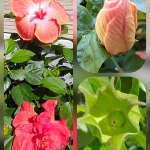 上 オレンジピンクのハイビスカス 久しぶりに咲いた 蕾が可愛い🧡 下 八重の赤いハイビスカス 種ができるのかな〜 花が咲いた二日目には いつも落ちてたのに⁉️ このままでいいのでしょうか〜