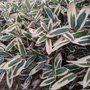 これは、クマザサ(隈笹)です。 葉に白い縁取りがある様子を、歌舞伎の化粧「隈取(くまどり)」にたとえたのが名前の由来✨ イネ科で、新葉のうちは緑色💚だが、秋から冬に葉の縁が白く🤍枯死して模様のようになります💞 クマザサは抗菌、防腐作用があり、医薬品の原料として適します🎶 葉🍀で食べ物を包んだり、青汁の原料としたり、お茶🍵として飲用したりします😃
