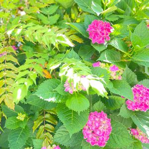 おはようございます🔆🔅 今日も暑くなりそうデス( ˊᵕˋ ;)💦 𖤣𖤥𖠿𖤣𖤥の鬼門(お若い方はわかるかな??) の柊南天と紫陽花デス✨✨ 柊南天にはブルーベリー🫐みたいな実が😊 紫陽花は実家から挿木したものが大きくなりました.・*’’*・.♬