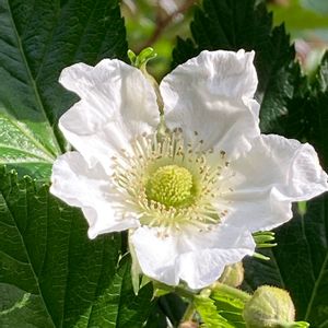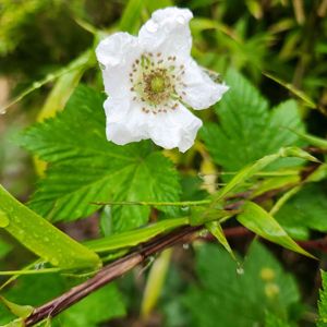 白いフリルのお星様🌟のような梶苺 親指姫のパラソルにも見えますが、🍓系のお花みんな可愛いですね 甘酸っぱい実も楽しませてくれるし😍 花言葉は「謙遜」 🏷純白マニア 参加させて下さいね💝