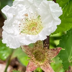 バラ科の梶苺の花とヒトデみたいな花後😁 雨で花びらがよれていますがどちらもキュートです🤍 花言葉は「謙遜」 今年はたくさん🍓生ってくれるかな♪ 🏷毎月15日はいちごの日