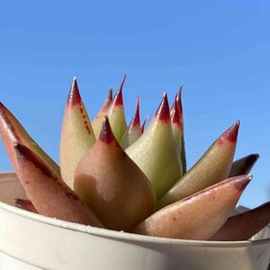 もうすぐひな祭り💕・・・に因んで エケベリアのメビナ 後ろ側にもに子株が出ているので、形が崩れてますが、色白にピンクの縁取りが美しい〜😍 よく増えて、葉挿しの成功率も👍 光の具合で、実物よりきれいです😊