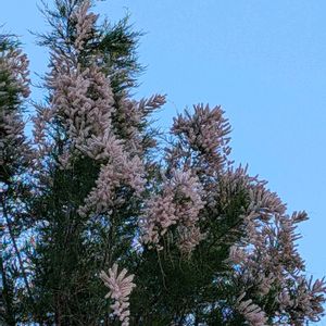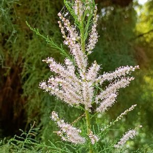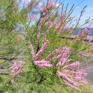 ギョリュウ(御栁) ギョリュウ科ギョリュウ属 落葉低木の広葉樹 何か咲いているのかな? 近寄って見るとピンクの花でした 白楽天や杜甫の詩にも登場 楊貴妃が愛した花木なのだそうです 葉は互生、鱗片状1.5〜3.5mmで無柄 針葉樹のようですが広葉樹 花は前年枝に春、当年枝に夏咲き 秋の花に蒴果ができる 種子は長毛があり風で散布される 日本には江戸時代に薬用として渡来 枝葉に塩腺があり余分な塩分を排出する、塩生植物 地下水を大量に消費し土壌塩分濃度を上げるため 世界の侵略的外来種ワースト100に入ってる 日本で野生化は確認されていない