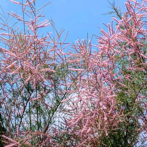 青空にギョリュウの花 ギョリュウ(御柳)[別名:タマリスク] ギョリュウ科ギョリュウ属 可憐な小さな花は2度咲き、春には前年の枝に、秋には当年の枝に咲き、秋咲きの花が結実する。