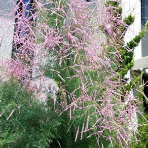 針葉樹のようですが、、、 ピンクのふわふわのこんな花、初めて見ました。 なんだろ ギョリュウと言うことがわかりました! 5月の花の季節に、たまたま通りかかって目に付いた。普段だったら素通りなのに。