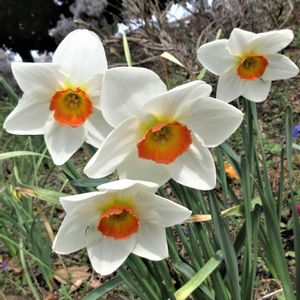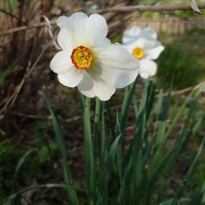 玄関前の牡丹の横で、口紅水仙が咲きました。 霜に当てられ、上から踏まれ。やっと復活して咲いてくれました。(たった2輪ですが。) 白くて優雅で、佇まいが美しいお花です。(^^)