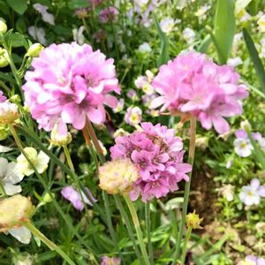 アルメリア(ハマカンザシ) 花言葉…『心遣い』、『思いやり』、『滞在』、『歓待』。 龍の髭に似てる〜と1月に投稿した“アルメリア”の花が咲きました。 他の方の投稿を見たら茎がもっとずっと長くてびっくり。小さい鉢に植えたので小さく育ったかな?種類が違うのかな。株分け出来る様なので地植えにしてみようかな〜😗 自生地は海辺の砂浜や草地らしい。 ケルト語で「ar mor(海に近い)」が語源だそう。自生しているのを見てみたい〜😊🍀