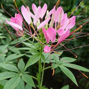 春にくみさんからいただいた大量のクレオメの種✨ 確か5月に蒔いて…スクスクスクスク…🌱🌱🌱 咲きました~*(〃∇〃人)*: このピンク、とっても可愛いです💗
