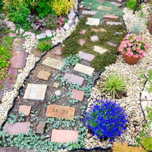 レンガ🧱の小道。 メインは廃材を使ったけれど 少なくて歩きずらくなって しまいました😥 隙間に植えた植物達は 暖かくなり元気に成長しています。 今年の冬は寒かったので ディコンドラが心配でしたが ゆっくりですが広がっている ようです。 リシマキア・ミッドナイトサンは 1番元気😊 黄色い花が咲き出しました。