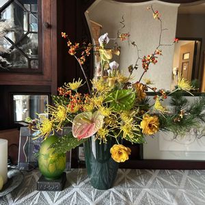 お正月の切り花を花瓶に生けただけです。もっと工夫して考えてアレンジメントにすれば良かった。