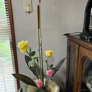 🐰さんの投稿を見て そうだ!ウチも見に行かなきゃ! と、ガマの観察に行きました。すると あるある!✨ もう穂が出ていました。 フランクフルトの部分ははまだ硬い緑で、その上に黄色い花穂が出ていて、触るとフカフカしていました。 ここは同じくらいの背丈の葦と混生しているのですが、ガマは扇のように葉が展開していて、芸術的な造形です。