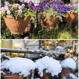 昨日夕方から夜にかけてまた❄️が降り、今は☔️模様 雨で雪が溶けて欲しい.ᐟ.ᐟᐢ ܸ. ̫ .ܸ ᐢ 1枚目 ピンクのシエルブリエ、❄️が軒下にも吹き込んでました。 2枚目 暖かい所で育った宮崎ビオラ達、寒いよね🥶 3枚目、4枚目 零れたねからのレディの鉢植えに黄色のレディ様が咲いてます。 雪を取り除いてあげました。 5枚目 三日前に寄せ植えした鉢、避難させるの忘れてた😱 キングフィッシャーデージーを入れてるのに大丈夫(´・_・`)カナ-