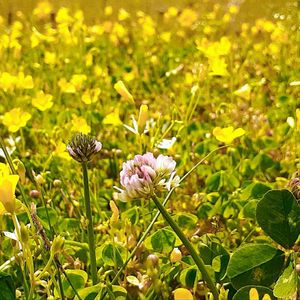 黄色の小粒、わんさか。クローバーの葉が大きくみえる。 マメ科シャジクソウ属 受粉が済んだ花から下向きになる。