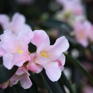 こんばんは🌙🌟 数寄屋侘助(すきやわびすけ) 淡桃色、一重咲き、猪口咲き 鋸歯が特徴的な濃い緑の葉をもつ木🍃