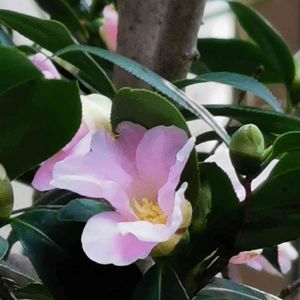 母の庭の侘助開いていました。 雪で傷んでいます😭 『数寄屋』か『太郎冠者』かを調べに 野々市椿館へ行きましたが わかりませんでした。 でも淡い薄桃色のぼかしや 濃い葉の色など なんとなく数寄屋かなと 思えます。