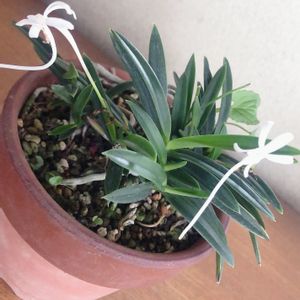 我が家のセッコク=長生蘭。 ピンクと白の二株が咲いています。 ちょっと姿が乱れてしまってるんで、 植え替えしてあげなくては❣️