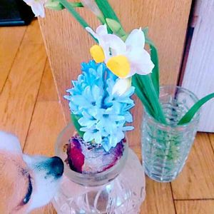 こんばんわ.+*:゚+。.☆ 今日は関東は寒そう!!事故のニュースも流れています。 皆さん今週は外出、通勤、充分気を付けてくださいね😰💦💦 今日は福岡は夕方から日が差して、まだ寒波は来てない様子。。 庭には春の花、スイセンが開花してました〜😊💞🌷 母が好きなので速攻チョンパして、母の鼻先に♥ かあちゃんうっとり笑顔になりました🌼.*(*´罒`*)♥ニヒヒ そして、ピーちゃんもクンクン👀🍴🎶 ヒヤシンスもスイセンも食べられなさそうだねぇ〜(笑)😆😚😚💟 春の香り、したかなぁ〜😳😶❤️?