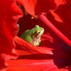 買おうかどうか迷ってるのに ハイビスカスの花の上に鎮座する カエルさん🐸