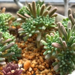 最近のお迎え記録その2です。 こちらは仕入先で購入。 左から、グリーンネックレス、柱サボテン、ルベンスリザード、サクサグラレです。 グリーンネックレスは販売用です。 あまりにすごいボリュームだったので買ってしまいました…。ぐるぐる巻いてあるのを取るのが大変でした😅 柱サボテンは、ちょっと前から自分用に欲しくて探していたのですが、ちょうどいい感じのがあったので購入。まだ品種は特定していませんが調べてみようと思っています。 これが、うちにあるサボテンでは最大になりましたね。(他はみんなちまちまサイズです…) セダムふたつは、カメレオンマークのブリリアントグリーンさんのものです。 岐阜県のセダム生産者さんのようですが、私は初めて買ったかも。 ルベンスリザードは、パリダムが大きくなってトップヘビーになったような感じです。 調べてみたら案外レア品種のようで、詳しいことがよくわかりませんでした。 紅葉しはじめていて、プルプレアみたいな薄紫色になりつつあります。 サクサグラレは、サクサグラレモスグリーンの色違い品種だと思われます。いちかわふぁーむさんが、セクサングラレという名前で出しているものと同じかな?これも案外レアかも。 モスグリーンに比べると少し色が薄いですね。紅葉時とか比較してみたいです。 私は、マンネングサ系統のもので持ってないものはできるだけ買うことにしています。 前は、似たようなものはいらないかな〜と思っていたのですが、今は目指せ!マンネングサマスター!なので、色違いとか似たようなものでも買ってます。 いつか、お客様が見られる場所に、マンネングサ植物図鑑みたいなコーナーを作りたいです。 まだまだ知らないものが多いのですが、 マンネングサならまかしとけ! くらいのレベルになりたいですね!✨