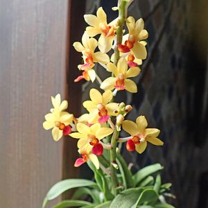 バンダとファレノプシスとの異種間交配種(バンダエノプシス)です。 とっても小さくて、花は一番大きいのでも18mmくらい。 でも結構強健で、毎年1株ずつ増えて今年初めて3株咲きました。 5年くらい前の蘭展で「ランもっと欲しい!でも育てる場所が…!」てなってた時に目に留まったものです。 どんなに小さくても咲いた時の喜びは同じですね😊✨