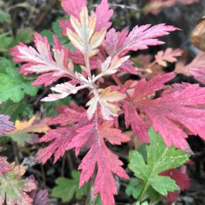 一枚だけ紅葉しているアメリカフウロの葉。 色も形も可愛いです。