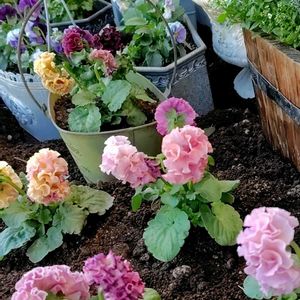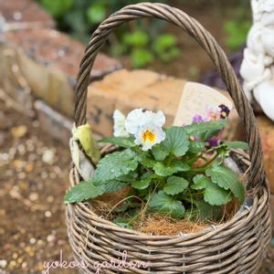 ①花日和さんのパンジー アルバルーチェ、昨日の雨でうな垂れていたので、花器に飾りました。 ②揷し木から咲いたいおりちゃんをバスケットに入れました。 ③②を左側から、今年はマリーゴールドが重宝しています。 ④全体の様子。 ⑤揷し木からの開花です。茎が長く地面に付き添いそうだったので、アイアンの手すりにかけちゃいました😅