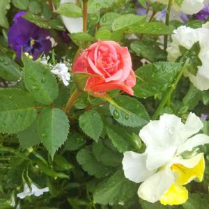 雨上がりのミニバラさん🌹 パンジーさんも可愛い💕