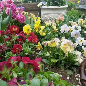 1年草のコーナー🎶 パンジーが元気に育っています。間にちょこちょこっとチューリップが💕早く咲いて欲しいなぁ(〃ω〃)