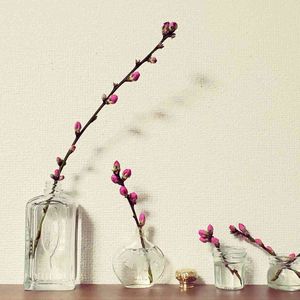 香水瓶が綺麗✨で捨てられず桃の枝の細いやつを挿しました🌼 2月はあっという間に終わりますね~💨