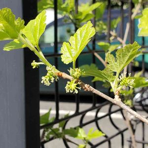 🐥さんの落とし物から芽が出たクワに花が咲いております。昨年季節外れに実がなって、あっという間に🐥さん達のお腹に入ってしまいました😵 今回は回収負けないぞ💪 そういえば蚕もクワの葉っぱが大好きだった❗
