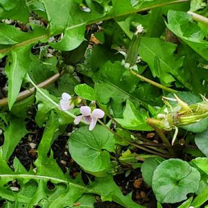倒れてしまったブルーベリーの根元に咲いていたスミレの種がこぼれてタンポポの隙間からコンニチハ👋😃 あなたはツボスミレ?マルバスミレ? いったいどちらさん('_'?)
