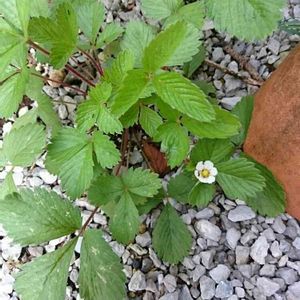 春に植えた四季咲きワイルドストロベリー🍓に小さな花が咲きました(^.^) 黒い点々は蟻さんです。ご容赦くださいませ😁