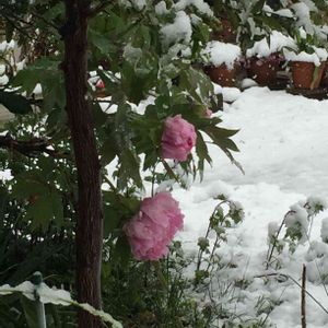 13:30分、やっと雪がやみました。 この花、牡丹?芍薬?どっちなんだろうか😅💦庭に咲いてるけど、区別がつかない私です。
