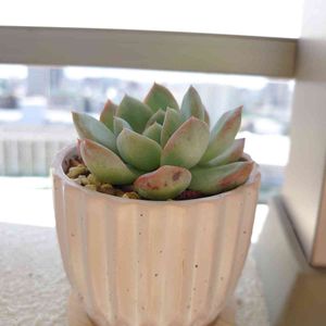 カルテ№205 エケベリア属 ウォーターリリー🌱 ド真ん中の日🏷に参加します🎶 ⬆️可愛い「ド真ん中」でしょう🤩 交配式は公表されてないですけど、これは!このカッパ口(•Ӫ•)は!きっとエレガンス入っとるでしょう!😆 2018年の4月にGS友から幾つか送ってもらった子の中に入れてくれてた子です😊 すぐに1号プラポットに植え付けて、明るい日陰で1週間、うちよりちょっぴり気温の低いところから届いた子だったんで、温度差と紫外線に慣らすためにさらに1週間の慣らし保育の後、我が家にいる他の子たちと同じ環境で育て始めました🌱 大好きなんで、既に我が家に大人な子が居たんで「早く追いつけ~、追い越せ~!」と育ててきました😆1号→2号→2.5号→3号(プレステラ90)とひと回りずつ鉢増ししながら、今は3.5号(プレステラ105)に入ってます🎵 ウォーターリリーのタグ🏷で育ててますけど、暫定の学名は「スリョン」。和名が「睡蓮」なんでウォーターリリーで売られてるんでしょうけど、ウォーターリリーはアガボ系の交配種に使われてる学名なんで、この子に使っちゃあダメなようです🤔 お迎えした時の名前でタグ🏷付けしてるんですけど、今年はこの辺りもできるだけ学名に変えて行こうと思ってます👍 あ!忘れてました!下の2つは友情出演のアリエルとクリスタルローズです🤭💕 。* ❤︎… 今日のひと言 …❤︎*。 体に見合った大きさの鉢に丁寧に鉢増ししていくと綺麗に育ちます☝️ 「たっちんのウォーターリリー」タグをタップでこの子の生長記録のみどりのまとめが簡単に見れます😊🎵