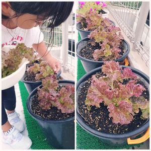 我が家のサニーレタス☆ 少し大きく育ちました🌱 今日は娘と一緒に収穫!! サニーレタスが苦手な娘も収穫は手伝ってくれます😆 今日こそは、自分で収穫したレタス食べてくれますように…😋