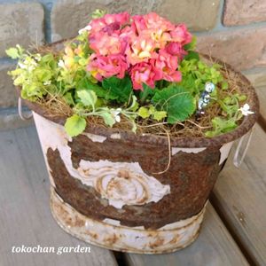 ブリキポット パラパラめくれて、丸裸になるのも時間の問題🤗底が抜けるほうが早いかしら😙