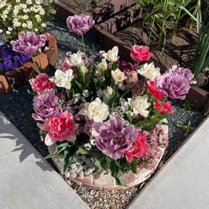 円形花壇の様子です✨ チューリップが咲き揃ってきました✨ 中央寄りに植えたピンクのアンジェリケはまだもう少しかかりそうですが... ブーケみたいにお花もりもりで可愛いです✨