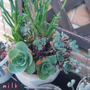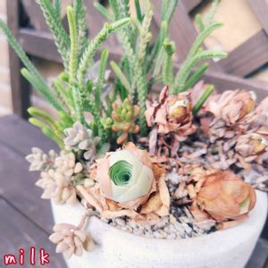 ①夏前にホムセンで見かけて、🌹みたい😍!と衝動買いしちゃったドドランタリス。 ひと〜つ、ふた〜つと減っていき、こんな瀕死の状態に😣💦。 お世話の仕方、ご存知の方あれば教えてください🙏。 ②☂️の寄せ植え、ペチャンコ過ぎたので手直し→③ これでかわゆくモリモリになるハズ😁。 ④お家の壁掛けに寄せ植え。 ハニワ添え🤭。 塀に掛けるのが、なぜか一番元気に育つんだよねぇ🤔。