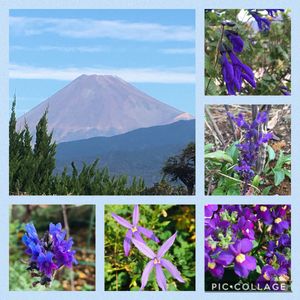 今朝の富士山スッキリ晴れて、雪❄️も溶け赤い山肌も見えました😊 庭に咲いている紫組を集めてみました🤗