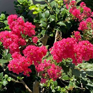 おはよう御座います。 眼下の百日紅です。 椿の葉っぱと混雑しちゃています😅 各々、鮮やかな色で引き立てあって いるかと(^^)