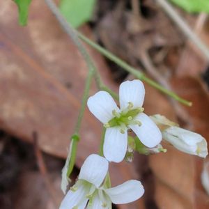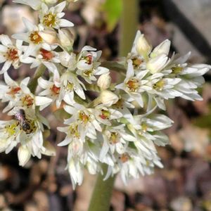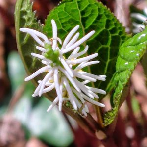 タンチョウソウ ユキノシタ科タンチョウソウ属 多年草 別名はイワヤツデ 中国東北部から朝鮮半島原産 川岸の岩上や川沿いの岸壁に生える。 花期2〜3月 花は葉が出る前や同時に、花径5mmほどの白い花を多数咲かせる。 白い萼と白い花弁が重なりあって、花びらが10枚あるように見える。