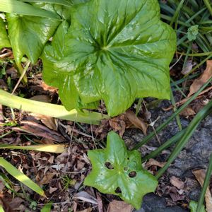 ハッカクレン(八角蓮) メギ科ミヤオソウ属 多年草 中国原産 葉っぱの形がおもしろく、直径15cm以上になる。 完全に広がると7〜9裂になる。 ハスに似た葉の角の数から「六角蓮」や「八角蓮」と呼ばれている。 この京都府立植物園のネームプレートにも、両方が書かれている。(②) 4〜6月に葉っぱの下に赤紫色または白い花が咲くらしい。 🏷️8日は葉っぱの発表会 に参加させていただきます。