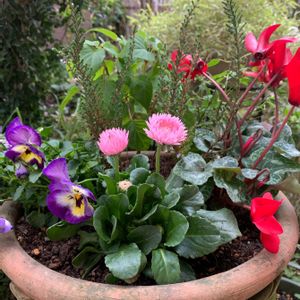 連投すみません💦 今年もお迎えしましたよ🏡 大きなピンクのチロリアンデージー🌸 お隣は真っ赤な安心院シクラメンと書いてありました。少しだけノッポさんです 後ろの方は何と10円のサルビアのグリーンです。 いいお仕事してくれていますペコリ(⋆ᵕᴗᵕ⋆).+* まだまだスカスカの寄せ植えです♡ᵕ̈*
