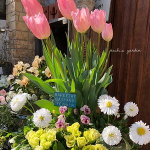 おはようございます☀ 植えて3週間程経ったチューリップメインの寄せ植え🌷 今が満開です🌸🌸 今日も素敵な一日となりますように😊