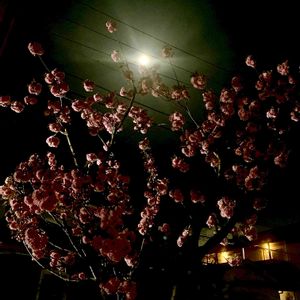 八重桜の向こう側に満月。 寝室の窓から。 これがピンクムーンだっ。