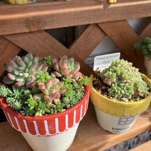おはようございます😊 夜中に激しい⚡️☔️の音😵💫 あ、ビニール掛けてない〰️と思ったけど間に合わず💦朝から水滴💧飛ばしです😂 赤❤️と黄色💛の鉢が並んでいい感じ✨ 赤い鉢の方…名前忘れた😬 寄せ植えもバランス悪っ、だけど ツブツブがモリモリ👍🍀
