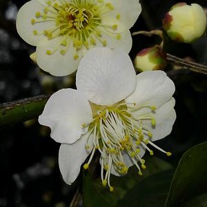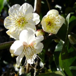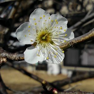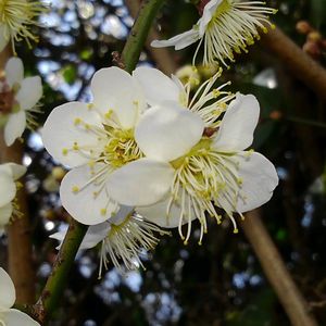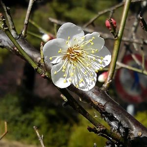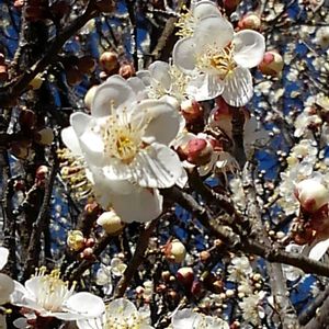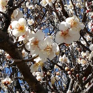 透き通る様な青空に 満開となった白い花 早春の甘酸っぱい香りを漂わせ 豪快に気持ち良く咲き誇る その萼は小梅色に染まり 後ろから見ると紅梅そのモノ 二色揃って紅白の 目出度い目出度い春の調べ 澄み渡る空に真っ白な花が 春を迎え呼ぶよ〜 白梅❀