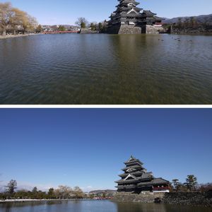 今日の松本城公園 ①お堀越しの天守 ⬆️ 南側から ⬇️ 東南側から ②梅と天守 東側 二の丸御殿跡から ③ユリノキ ④コブシ 📸 3月3日 9-10時
