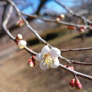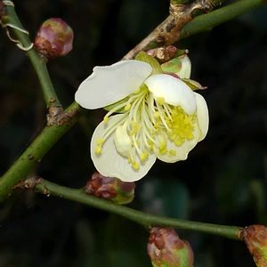 白梅 (ハクバイ)バラ科サクラ属 1月20日に紅梅が咲き始めました。 昨日やっと白梅が咲いてる木を見つけました。 まだほんの少ししか咲いてませんでしたが、蕾はかなり膨らんでました。 暖かくなったら一斉に咲きそうです。 4⃣ アップで 5⃣ 後ろ姿も素敵、萼が赤いのが目立ちます。 白梅と紅梅は、花の色ではなく木の幹の断面の色で区別されます。 紅梅は白梅よりも開花時期が早いそうです 🏷 白い水曜日♡ 🏷 白い貴婦人✨